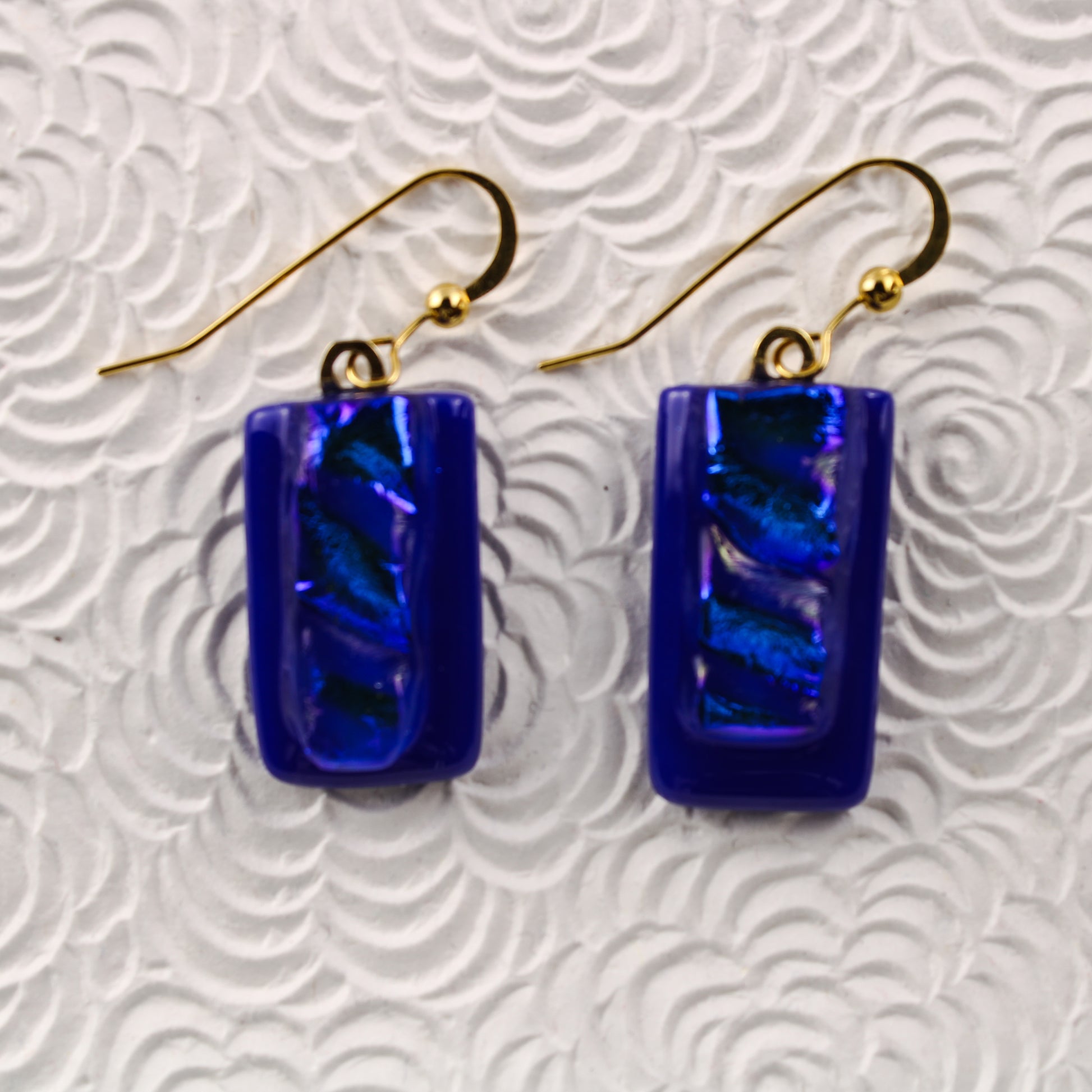 Blue fused glass rectangular earrings with gold-plated hooks with a textured dichroic blue glass center.