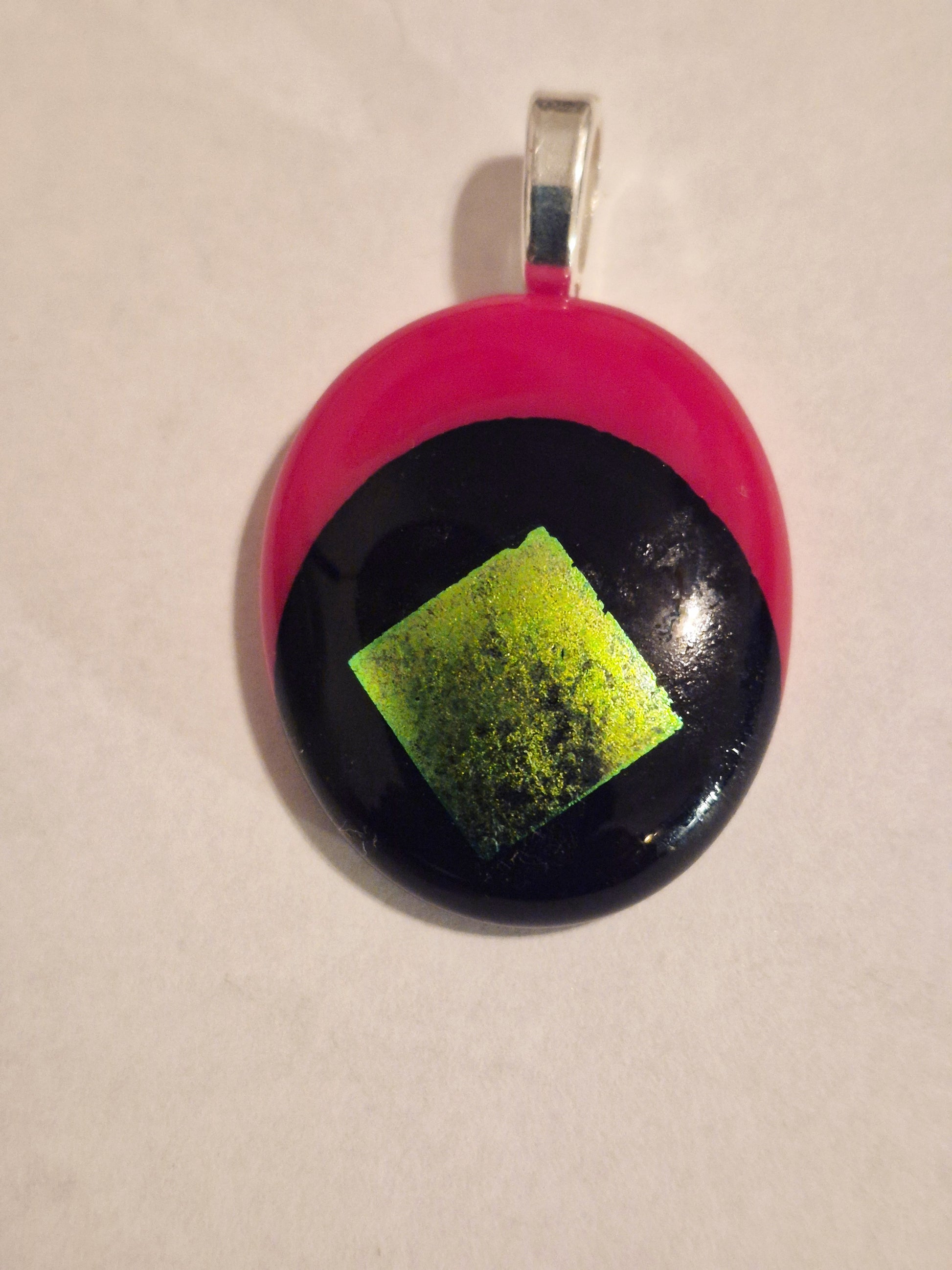 Crimson Prism fused glass pendant is a modern design, featuring a vibrant red glass backdrop that highlights a luminous geometric centerpiece. With its contemporary elegance and unique aesthetic, the pendant effortlessly enhances any ensemble with refined sophistication.