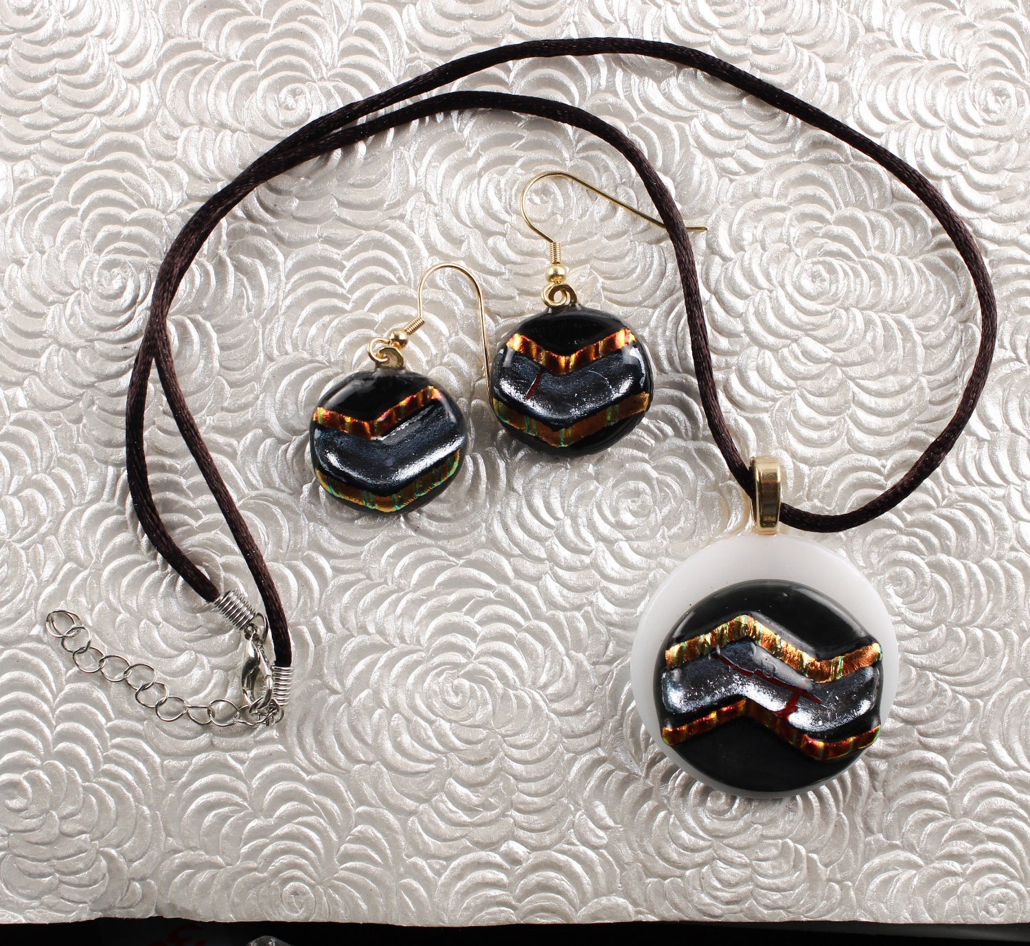 The Focus Wave Pendant features a 40 mm (approximately 1.6 inch) pendant made with elements of fused dichroic glass with accent waves of color. Earrings are one-inch round, complement the pendant design. The set has a unique design that adds to any outfit and makes a statement. A free complimentary satin chain or stainless steel is included.